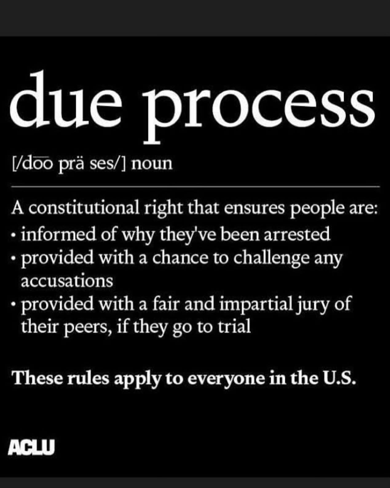 Every human being gets due process. That's what makes AMERICA GREAT. We do not have KINGS or DICTATORS. Get it? We don't have a police state like North Korea has. The USA is not a dictatorship, as trump wants us to be. No one can be abducted off the street by ANYONE in a uniform (thugs in masks who don't identify themselves) without being told of their rights and given a chance to dispute any charges. INNOCENT until PROVEN GUILTY is what makes us the land of the FREE. it's enshrined in our Constitution. #dueprocess #refugee #asylum #immigrants #nokings